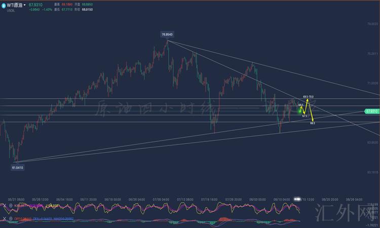 原油层面,日K线来说,原油星期四下探回涨,最低回测66.70一线再次启稳回涨,美元走软抵消了政府数据表明原油库存降幅差于预计的影响,美国号召欧佩克+联盟以更迅速度复苏产能。原油价格下探不破低,守稳颈线上方再次回涨收高,日K线形成双连阳回弹。友良觉得从日K线的结构来说,临时挑战住了颈线的核心支撑,周初不失守。短线持续拉锯震荡。原油4小时形成了二次下探回涨,一次65.10,二次66.70,局部结构形态小周期级别的回弹往上走法,且连阳接近前一台阶高位,弱势行情回弹过高。过高则会转震荡,日间短线思路转换成震荡。