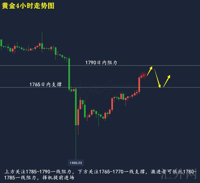 黄金技术分析来分析,日K线上,星期五黄金保持前两个交易日上涨趋势,又一次上升,盘中刺破MA10日移动均线,报得实体大阳,日K线上,即使黄金在星期五打破日K线压力,但周线均线抑制依旧存在,仍有回调的机会性;4小时上,星期五黄金呈震荡上涨行情,持续上涨,盘中刺破上缘后延上缘运行,目前布林带处在开口期,MA均线三线往上,呈买方排列,KDJ随机指标三线向前,到达超买,MACD指标红色量能柱连续放量,快慢线金叉往上,综合来说,黄金当前短时间不提倡过分看多,在行情没有击穿周线压力,仍有机会面对短时间回踩,下星期一推荐高空低多执行操作,上方注意1785-1790一线压力,激进派可依托1780-1785一线压力,择机提早进场,以下注意1765-1770一线支撑。