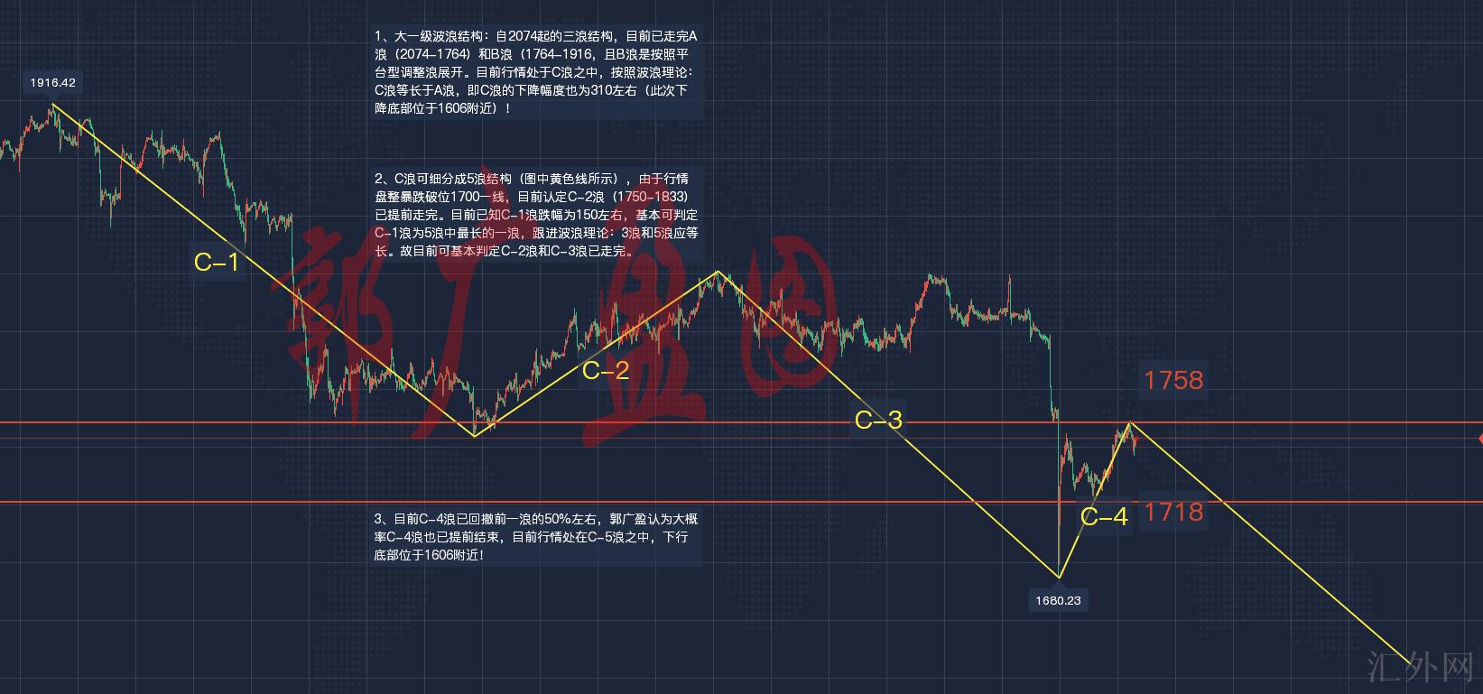 2、C浪可细分成5浪结构(图中黄色线所示),受于行情横盘痛跌突破1700一线,当前认定C-2浪(1750-1833)已提早走完。当前已知C-1浪降幅为150附近,差不多可判定C-1浪为5浪中最长的一浪,跟进波浪理论:3浪和5浪应等长。故当前可差不多判定C-2浪和C-3浪已走完。