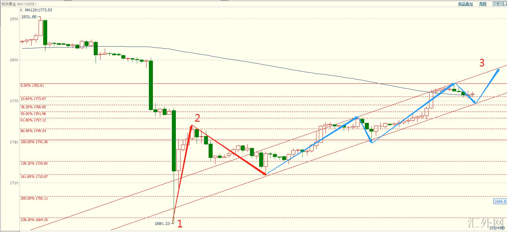 黄金仍在针对前期的下挫执行回弹,在回弹的过程中迈出了上涨通道,日间价格靠近通道上沿造成滞涨,造成7美金附近的回调空间,参照波浪理论来说当前处在3浪当中,结构上3浪的上涨大约率会迈出5波行情,所以依旧等候价格调动博取上升的5浪,当前以下还具备适当的区间,所以晚评给到的思路依旧等候价格回调,以逢低买涨思路为主。推荐等候回调至通道下沿与黄金分割38.2%的位置1766~1767一线多单介入,风控点放置1762以下,计划位目睹1782~1775。(博易大师报价,鑫顺波浪理论)图片是黄金2小时图