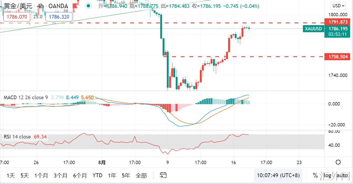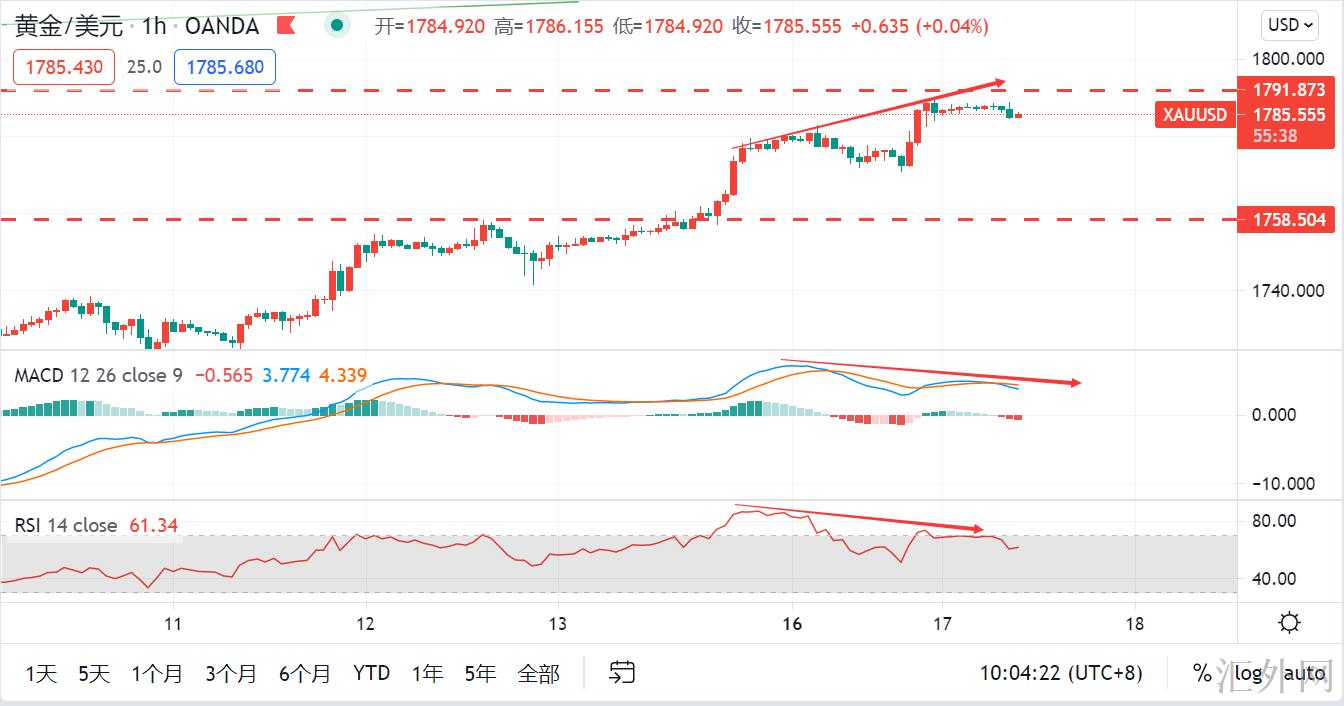 黄金4小时图,可以目睹黄金在1790以下迈出平顶,4小时级别的MACD快慢线在上穿0轴后面开始萎缩粘合,同期RSI也已经超买了,又一次表明黄金在1790一线短线筑顶回调的机会性正在放大。