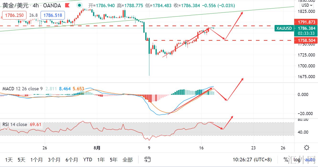 黄金小时级别,黄金小时级别可以异常显著的目睹MACD和RSI都迈出了顶背离形态,同期黄金上方还面对着1790核心抑制位的抑制,跟我以前的预计维持统一,黄金会在冲顶到1790后面迈出回调,以下着重关注的支持是在1760一线!