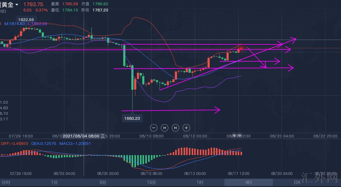 今日黄金午后击穿1790抑制,又一次高点盘整修正,形态上任然维持极强上涨局势。但今日往上击穿后面迄今为止只5个点上升幅度,尤其是核心抑制击穿行情没有形成保持就是典型逼空上升,从1680持稳上升,每波上升的程度逐渐减弱,买方已成强弩之末,上方仍有核心位置遇阻,小时线指标已经呈现背离信号,黄金随时有机会掉头,欧盘1790已经入场空,1795可持续空,止损1802,黄金这段回撤止损可见1769-1757名置。