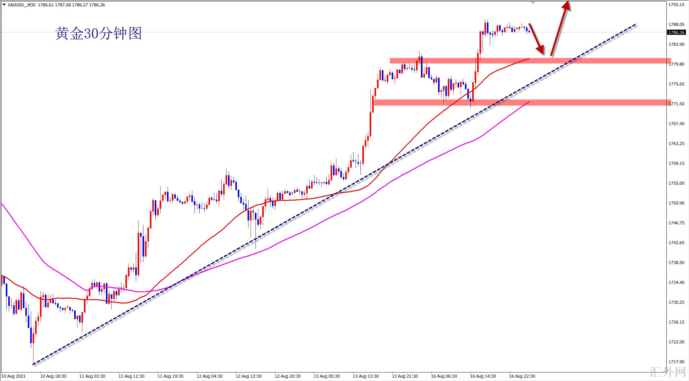 买方异常强劲,操作上我们依旧低多为主,不买跌,回调就是干多的可能!目前30分钟上均线平行上升,支撑K线稳健抬升!而且1小时行情上,黄金均线金叉支撑行情更深一步上升,这是波段上升的可能!即使黄金暴涨后有回踩,也是干多的可能,而且回踩的程度总体有限!