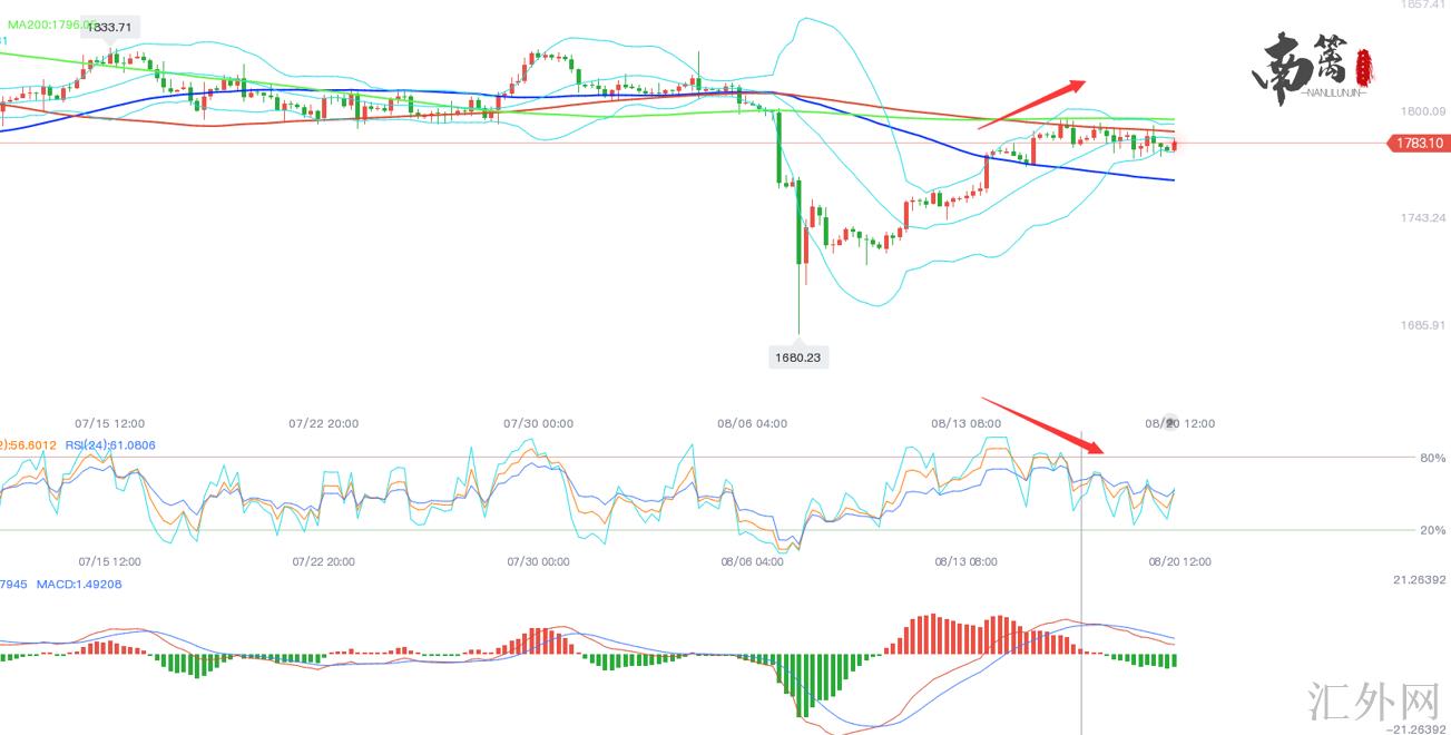 所以要看指标修正你不如去看四小时结构的RSI超买背离,阶段中渐渐被时间消化致使修正空间并没有大,短线中的居高震荡反而致使小级别中重心逐渐抬升。所以结合大小周期说,黄金大约率会显现技术性的回撤修正,到时在1772/1760等标准支撑点得到适当的回弹量能,如此一来也符合了日K的底背离修正状态。