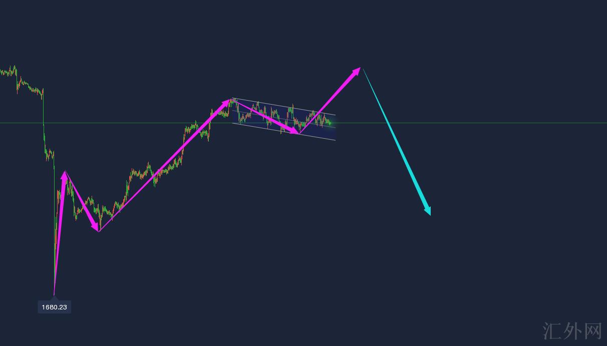 从1680开始的上涨,一开始预期为ABC的三段反攻,但这周自星期一给出高位后全部处在震荡环节。节奏上是买方,迟迟不朝下击穿即代表高位仍未出,三转五的行情,所下方周操作上先驱低多,待高点找寻背离后再中空即可。