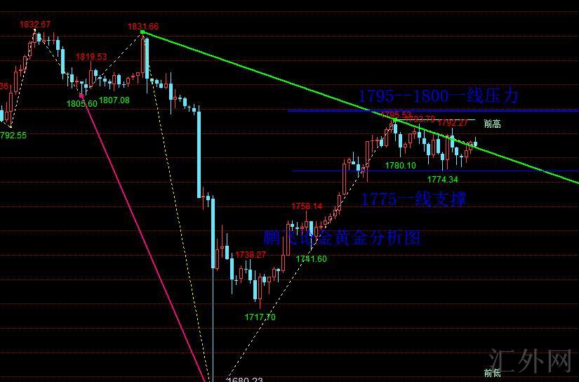 从日线图来说,价格想更深一步上涨击穿1800关键点位依然需要一次空中加油,而日线图价格运行于5-10日移动均线上方成买方排列,但是价格在半年线处受压,收盘于5日移动均线以下,价格有更深一步回调10日移动均线的态势,单K显现上升暂停信号,着重是昨天的收盘,一旦收成中阴同期跌穿1763表明回弹终结,正式开放卖方,但是价格假使摸底回涨破93代表着有冲1800的可能,技术分析上当前接连反攻图表一线抑制,按操盘法则又一次冲顶以下空,突破后反手多看1810-18一线。从4小时图表来说,由底线到小时图上线受压回调,当前依旧偏空,按此运行对于早盘来说仍有一杀,那着重注意1772支撑,突破更深一步下探去1763一线,而上方当前结合日线图几个周期阻力下探到1789一线,破96破平衡,弱市回弹哪就是1786这里,所以综合分析下星期一操作上鹏飞论金推荐回踩低多为主;上方注意1795-1800压力,以下注意1775-1770支撑;
