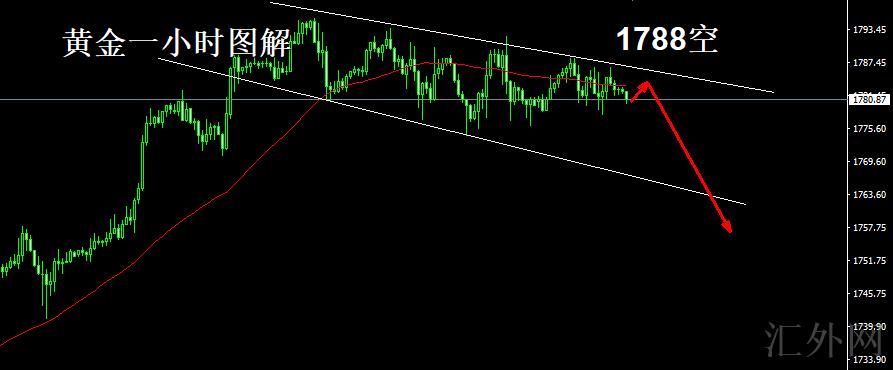 黄金一小时k线呈现震荡下探,高位一直朝下减弱,同期压力位1800始终未能冲出包围圈,当前行情显著是属于卖方趋势,显著的朝下通道,多次冲顶无力,下周持续保持高空为主,1788-90区域可以进场空
