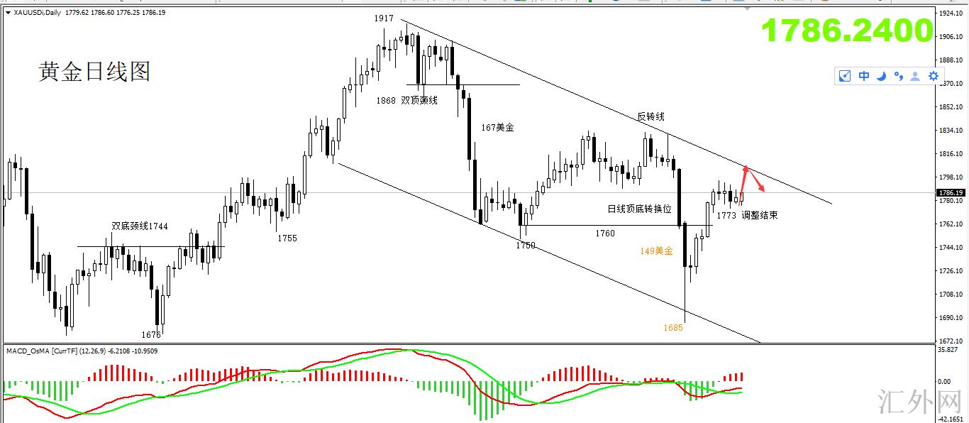 4小时层面,依旧我们上周强调的看到往上击穿位的几个点,其一,有阴线下挫后便会显现强阳推涨,今天又一次显现了该种现象,表明了下挫量能的不足,其二,k线形态不是顶部形态,依旧运行在上升旗形通道内,然而重心已经在逐渐往上移动,表明行情离突破越来越近了,其三,最近黄金行情偏多,非美货币下探的时机黄金降幅却很弱,跟美元稍微同涨的意思,而在上周非美货币超跌后面,周初都面对短线的回弹,而黄金在如此的情形下,会一马当先的上涨,这些我们看多的差不多条件都没有发生更改,所以我们今天依旧保持星期五的1782布局多单思路,看1790一线突破,初始上升计划看1802一线。