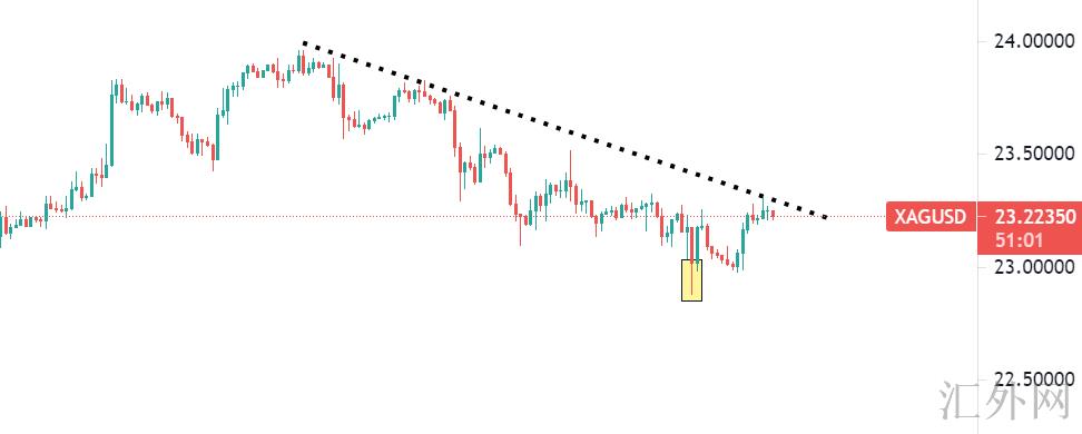 你们目睹图中的趋势线肯定会觉得没突破是吧?这要看你从哪个角度去分析了,假使导致单纯的右半侧下挫行情,那肯定是没突破,甚至当下还受压了,但若是以底部的这段偏中性下挫来说,它有些更改前期下挫角度的意思,小方框标注的下挫低位算是一个砸盘了,由于这个点已经不是单纯的水准位,是前期金银早上闪崩的实体线以下,所以我觉得白银的潜在回弹力量最大,它的震荡也将令在回弹发生前变的更小。