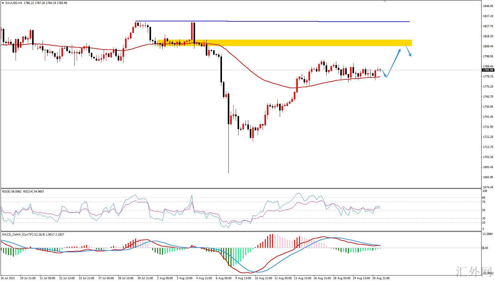 首先就是指标MACD快慢线靠差不多0轴后,马上形成水上金叉,这在技术面上是显著的购入信号。而rsi指标也同样上穿了50水平位,有持续上冲的趋势。