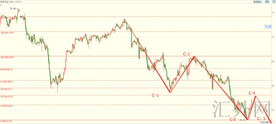 新的一周,让我们再接再厉,保持前两周原油策略88.8%高胜率的辉煌。原油当前依旧处在C浪下挫当中,上星期五价格运行至通道线下沿止跌,短时间显现回弹需求,但是日线和周K线都收出了光头阴线,表明空方力量任然强势,后期依旧以买跌为主,今天日间价格连续回弹,但是整体趋势仍未更改,从波浪结构来说,目前处在C4回弹浪当中,我们耐心等候C4回弹到顶,顺势操作C5下挫浪,美盘时段,价格回弹至黄金分割38.2%左右,显现滞涨信号,空单进场,参考点位64.8—64.9左右空单进场,风控点放置65.3上方,计划位目睹64.0-63.7区域。(博易大师报价,钱鑫顺波浪理论)图片是原油2小时图