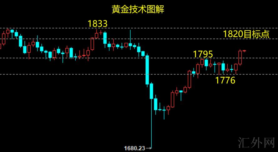 黄金,大趋势接昨日分析所述,此次价格从1680低位回弹到1795滞涨后上周接连回撤震荡蓄力,文中强调这周仍可先看1770低位再去调仓转多;事实星期一从1776平行低位迅速回涨,并提早进入买方突破周期;盘中及时调动思路看多1795突破,当前已顺遂击穿1795到1800上方;日线图报得大阳,K线组合呈买方排列,预计日间将保持上升,并试探1810通道压力,突破则持续向上瞧1820及前期平行高位1833;