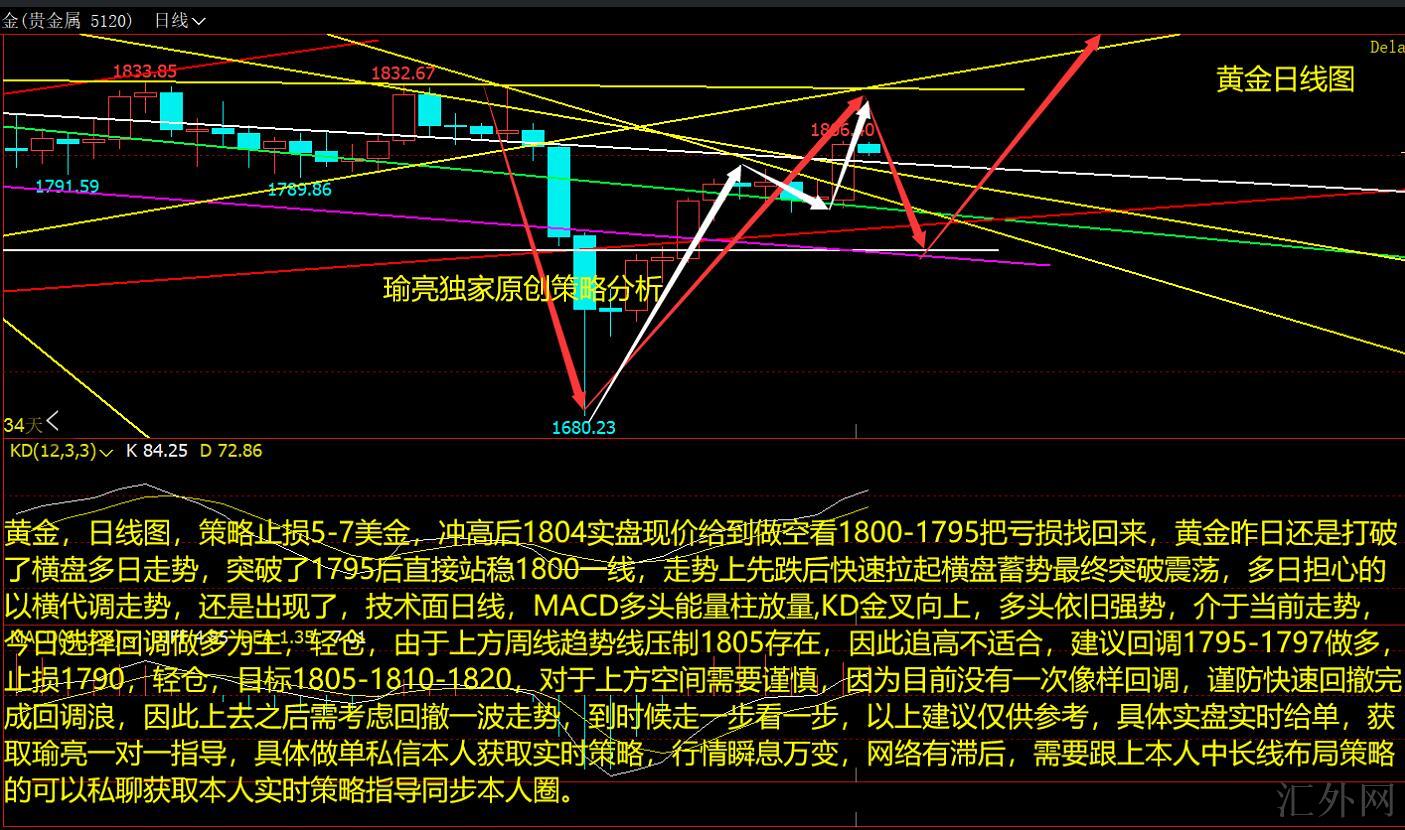 黄金,日K图,昨日策略止损5-美金,实盘冲顶后再1804现价买跌计划1800-1795,小赚把亏损找回来,是打破了盘整多日行情,击穿了1795后直接立住1800一线,行情上先跌后迅速拉起盘整蓄势最终击穿震荡,多日担忧的以横代调行情,依旧显现了,技术分析日K线,MACD买方能量柱放量,KD金叉往上,买方依旧强劲,介于目前行情,今日选择回踩买涨为主,轻仓,受于上方周线趋势线抑制1805存在,所以追涨不适合,推荐回踩1795-1797买涨,止损1790,轻仓,计划1805-1810-1820,对于上方空间需求审慎,由于当前没有一次像样回踩,谨防迅速回撤完成回踩浪,所以上去后面需斟酌回撤一次行情,到时候走一步看一步,以上推荐仅供参考,具体实盘实时给单,获取瑜亮一对一指导,具体做单私信本人获取实时策略,行情瞬息万变,网络有落后,需求跟上本人中长线布局策略的可以私聊获取本人实时策略指导同步本人圈。