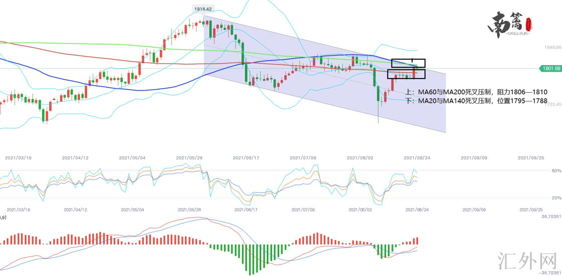 大周期日K结构中,黄金的收线在指标统一性上发挥了作用:昨日说到日K存在均线看跌与MACD底背离修正看涨的情形,所谓同周期不同指向的技术性相悖在黄金的拉涨中有显著改观。从中阳的运行节奏说,上方留存最后一同压力,也是日K中从1916途经1831形成的通道上缘抑制。巧合的是,从8月4号显现高位1831遇阻后面,60日移动均线开始依顺通道上缘运行,而60与200日移动均线的死叉结构正好位于1806。