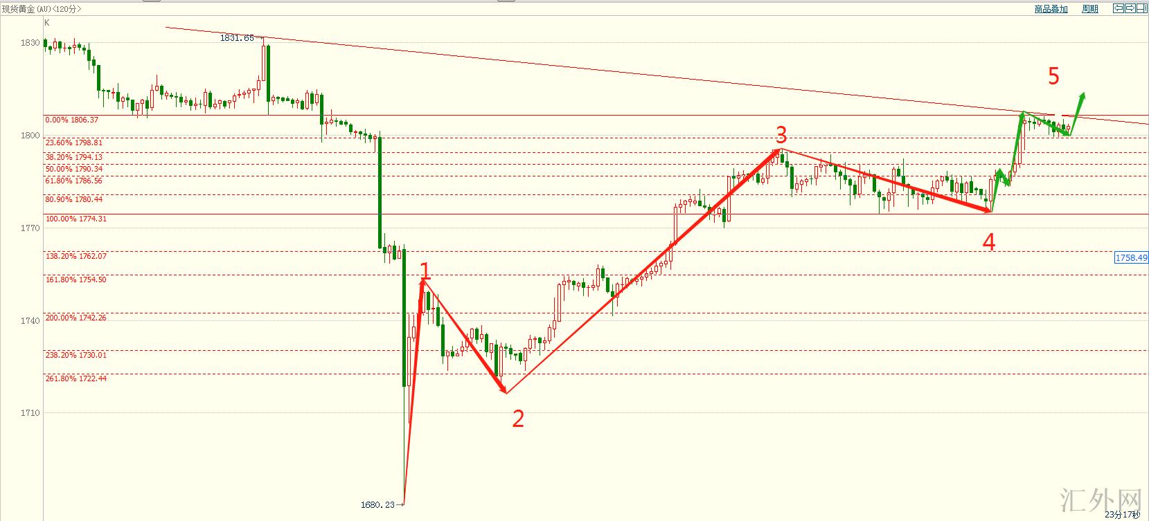 黄金昨天夜里终于解脱了4浪的调动区间,买方在昨天美盘时段开始发力,价格到达了1806一线,受制于趋势线的抑制日间并没有太大的震荡,只有5美金附近的震荡空间,不具备太多的操作性,参照波浪理论对5浪执行细分,可以分析出大约率会迈出5波结构,代表着日间的震荡在走4浪的调动,整体思路依旧以看涨为主,美盘时段推荐等候价格回踩到1800一线多单介入,风控点放置1793以下,计划位目睹1810-1815。突破持有目睹1825(博易大师报价,钱鑫顺波浪理论)图片是黄金2小时图