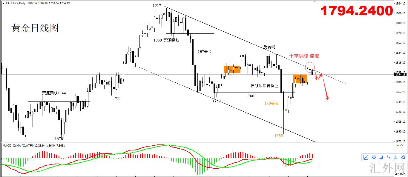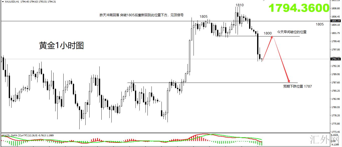 需求注意的是,下挫不会一步到位,假使按预计到达1780左右,则需求谨防行情显现二次试探下探通道上缘压力的现象。诚然,昨天说过,历史不会简单的重复,上次形成的顶部形态运行时间比较久,是一个双顶形态,本轮预计到顶时间比上次快些,更倾向一个小型的头肩顶形态,等今日收线后,再更深一步执行跟进。