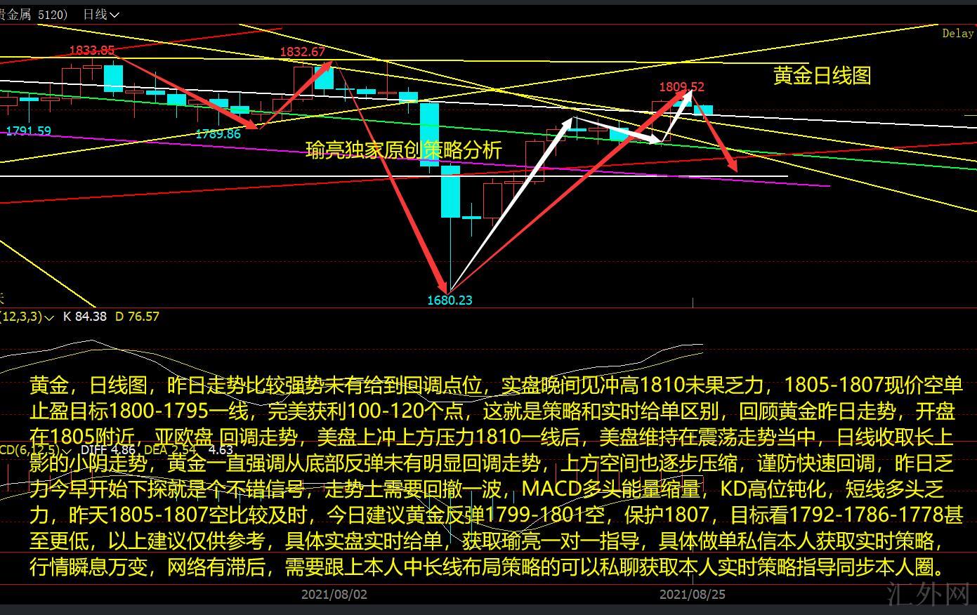 黄金,日K图,昨日行情比较强劲未有给到回踩点位,实盘夜里见冲顶1810没有成功疲软,1805-1807现价空单止盈计划1800-1795一线,完美获利100-120个点,这就是策略和实时给单区别,回顾黄金昨日行情,开盘在1805左右,亚欧盘 回踩行情,美盘上冲上方阻力1810一线后,美盘保持在震荡行情当中,日K线收取长上影的小阴行情,黄金一直强调从底部回弹未有显著回踩行情,上方空间也逐渐压缩,谨防迅速回踩,昨日疲软今早开始下探就是个不错信号,行情上需求回撤一次,MACD买方能量缩量,KD高点钝化,短线买方疲软,昨天1805-1807空比较及时,今日推荐黄金回弹1799-1801空,保护1807,计划看1792-1786-1778甚至更小,以上推荐仅供参考,具体实盘实时给单,获取瑜亮一对一指导,具体做单私信本人获取实时策略,行情瞬息万变,网络有落后,需求跟上本人中长线布局策略的可以私聊获取本人实时策略指导同步本人圈。
