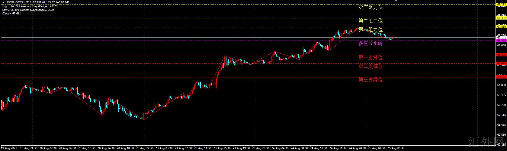 今日凌晨发布的报告表明,美国到8月20号当周美国石油协会原油库存降幅差于预计,令收盘原油价格短线回调。原油白盘若遇阻68/68.8区域可轻仓空一次,防守69,计划66/66.5,今天夜间着重关注原油报告发布前后,原油回踩后面,多单介入机会,在上轮我提示的很清楚,交割后是布局原油多单的好机会,不少朋友都跟上原油62多单的,当前都美滋滋了,那么昨日给到的原油高位也到位,今天着重的就两个位置,66.9的突破下探试探支撑,和68的突破上涨量能,需求注意