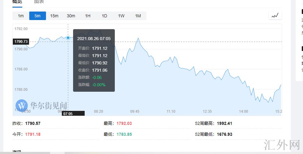 星期三,伴随美国国债收益率上升,黄金现货有所回调,并跌穿核心支撑点1800美元,美开盘之出最多增速下挫,最终收盘下跌0.67%,报得1789.92美元每盎司,报得两周多以来的最大单日降幅.