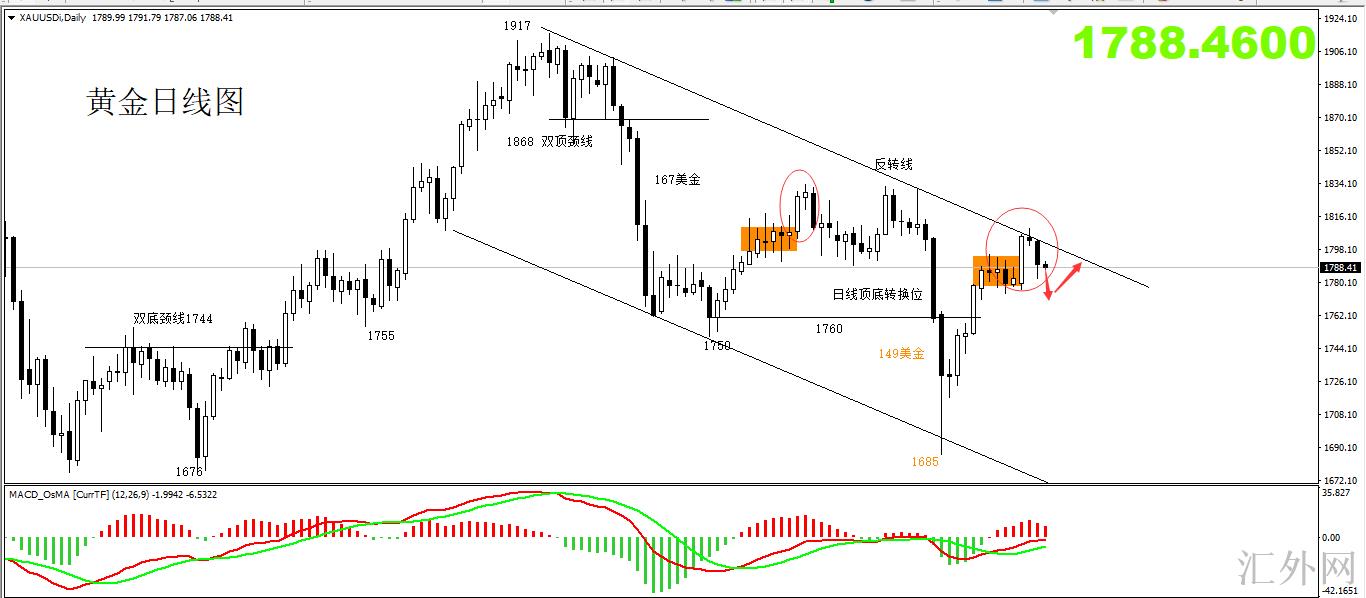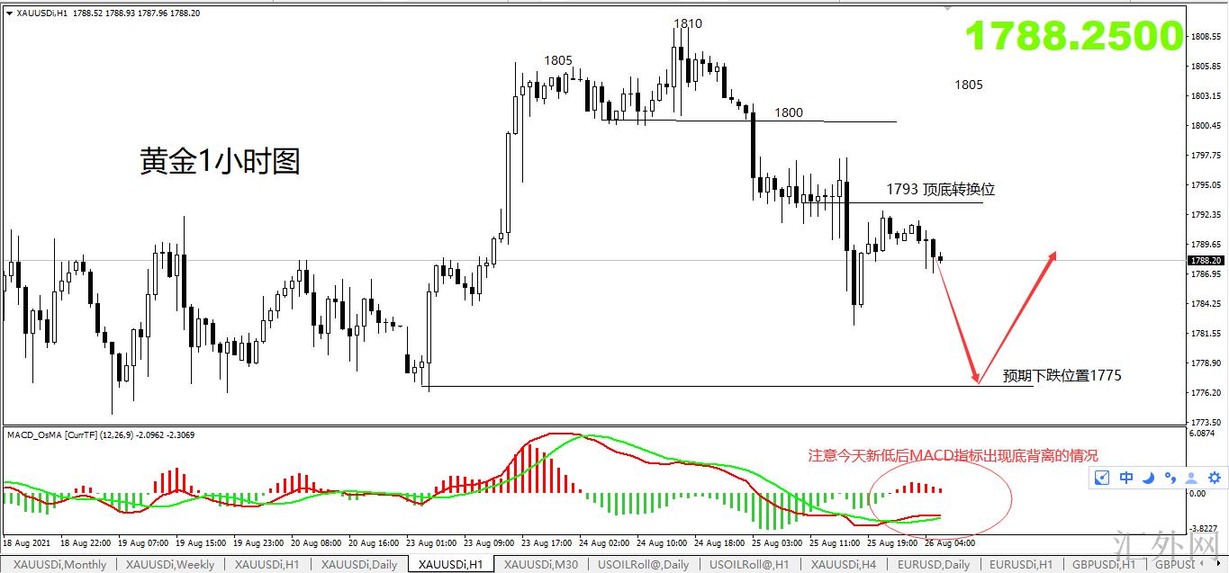 今天短线层面,注意1791的顶底转换位,1小时是一个完整的下探结构,此位置是买跌的最好防守位,一旦行情击穿此位置,则下探结构遭到损坏,今天预计的下挫计划在1775一线,此位置是星期一突破起涨的位置,同期,也是支撑震荡区间的底部,具有较强的支持,不好跌穿,这也是此段1小时下挫最终所看的位置,需求特别注意的是,今天迈出新低后面,1小时MACD指标迈出底背离回弹的机会,等行情抵达1775后,1小时的顶底转换位则移动到了昨天低位1782,,再从新回归此位置上方,则于是着行情将要二次而是日K线下探通道上缘压力1795一线。