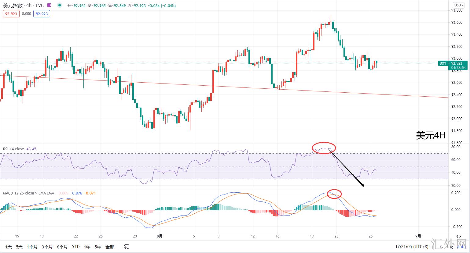 那么确定了,美元在日K线及周线上不会走大幅回调,我们再来说下短线,美元4小时图,美元在冲顶到93.7一线后面,受于短线的RSI超买开始执行回踩修正,跌到92.8后面接连两次试探了92.8的支持仍未跌穿,4小时级别的MACD快慢线萎缩黏合有金叉或许,但是RSI仍未超卖,而且快慢线金叉的位置距离0轴很近,不具备筑底回弹的特质。