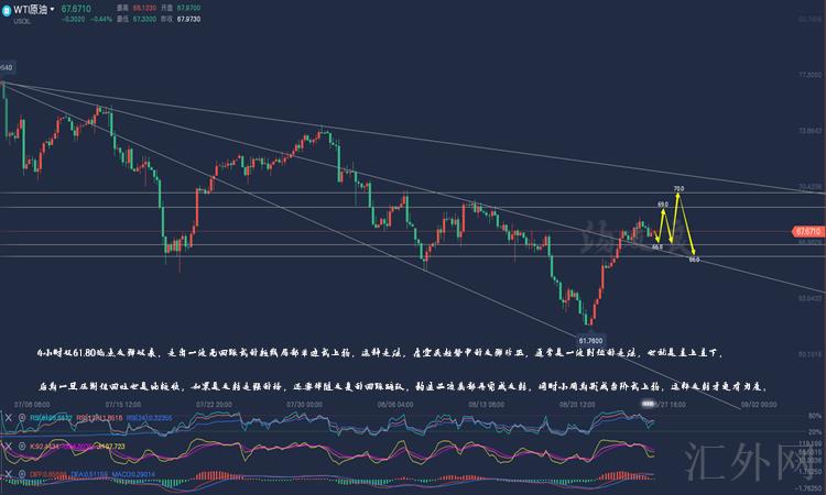 原油小阳线保持上升,伴随了反复的下探回涨,最低66.90.最高68.48.日K线形成连阳回弹,但实体K线在降低,从低点回弹以来,接连放量后开始缩量。回弹量能有所消弱。然而形态上仍未显现冲顶回调收低的走法,致使从新走跌的时间持续推后,短线接连回弹后会进入局部震荡。4小时从61.80低位回弹以来,迈出一次无回踩式的短线局部单边式上升,该种走法,在卖方趋势中的回弹修正,一般是一次到位的走法,也就是直上直下,后期一旦抑制住吐回也是比较快。假使是反转走高的话,还要伴随反复的回踩证实,构造二次底部再完成反转,同期小周期形成台阶式上升。如此反转才更有强度。而当前仍未显现,这段回弹,跟在此之前65.0回弹到74.18高位的走法极为类似。直上直下的走法。然而在此之前是构造双顶的右顶。当下是双顶突破颈线后的反抽证实,而证实的区域较大,致使走跌的时间在推后。同期小周期形成了逼空式的洗盘上升。加大了短线操作难度。综合来说,美盘午夜原油操作上汤友良推荐以回踩低多为主,回弹高空为辅,上方注意69.0一线压力,以下注意67.0一线支撑。