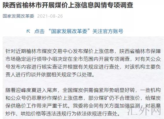 适合注意的是,国家发改委官方微信8月26号公布消息称,陕西省榆林市开展煤价上升信息舆情专项调查。