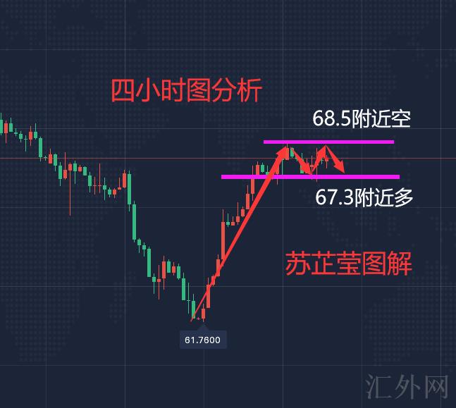 原油昨日在67-68.2区间内震荡,日K线以阴十字星收尾,日K线中轨抑制下接连在高点收取十字星,日间持续震荡为主。四小时图来说,布林线有收口态势,MA20中轨支撑在67.3左右。一小时图来说,布林线走平,MA20以下支撑在67.4左右。今日原油操作苏芷莹推荐回撤低多为主,高空为辅。