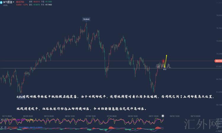 原油昨日再收十字K线震荡,最高刷新68.30.最低刷新66.90.空间未放出显现,差不多保持在上一日的区域内来回拉锯震荡,上未破高,但也没有显现冲顶回调收低的走法,局部形成拉锯震荡,日K线双十字表明短时间上涨略有减缓,留心今日周线收官之走法。4小时线回踩布林道中轨轻微启稳震荡,受于日K线的收盘持平,致使短时间临时看不出多空保持,而周线已到了上周的最高位位置,短线略有收盘持平,但仍未执行形态上的转换回调,今日仍要留心是否完成冲顶回调。在震荡中从新转换下挫。日间短线大约率仍是缩减震荡走法,迈出区间等候下周。短线先关注昨日区间内震荡,操作上临时保持区间内上缘择机空。综合来说,原油今日收盘短线交易参考上汤友良推荐以回踩低多为主,回弹高空为辅,上方短时间着重注意69.5-70.0一线压力,以下短时间注意67.5-67.0一线支撑。