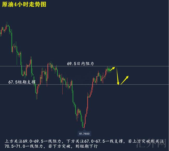 原油技术分析面来分析,日K线上,星期五原油依托MA5日移动均线展开回涨上升,盘中刷新日间高点后适当回调,报得上影线的中阳,日K线上,原油并没有击穿周线MA10日移动均线阻力,或短时间到顶或高点盘整的机会性较大;4小时上,星期五原油呈震荡上涨趋势上升,并在刷新日间高点后创下高后持于高点盘整,目前布林带马上开口,MA均线三线往上,KDJ随机指标三线朝下延伸,MACD指标顶背离,快慢线有朝下趋势,综合来说,原油当前或短时间到顶,下星期一交易参考高空低多执行操作,上方注意69.0-69.5一线压力,激进派可依托68.8-69.3一线压力,以下注意67.0-67.5一线支撑,若上方击穿则注意70.5-71.0一线压力,若以下击穿,或短时间下探。