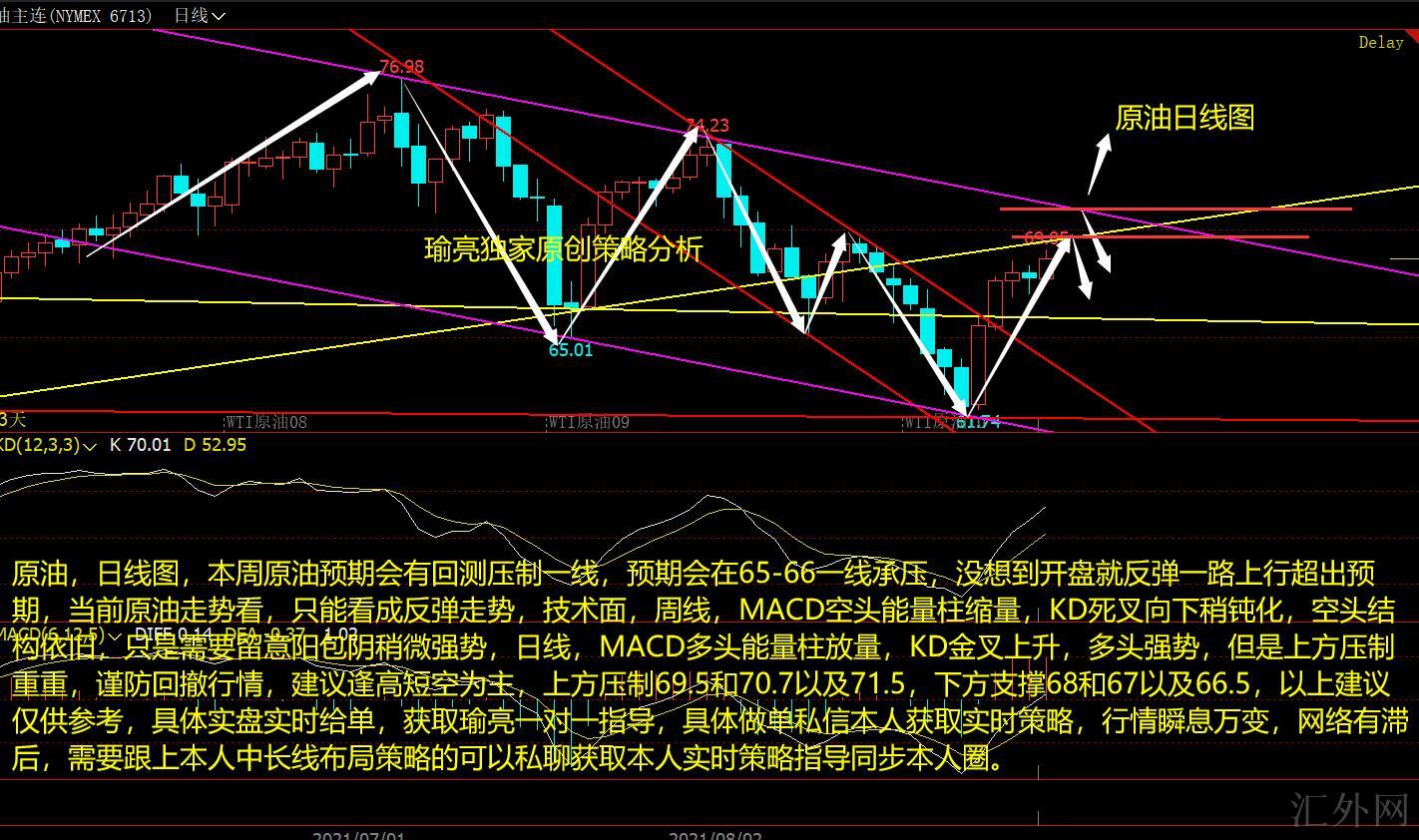 原油,日K图,这周原油预计会有回测抑制一线,预计会在65-66一线遇阻,没想到开盘就回弹一路上涨多出预计,目前原油行情看,只能看成回弹行情,技术分析,周线,MACD卖方能量柱缩量,KD死叉朝下稍钝化,卖方结构依旧,导致需求留心阳包阴略微强劲,日K线,MACD买方能量柱放量,KD金叉上涨,买方强劲,但是上方抑制重重,谨防回撤行情,推荐逢高短空为主,上方抑制69.5和70.7以及71.5,以下支撑68和67以及66.5,以上推荐仅供参考,具体实盘实时给单,获取瑜亮一对一指导,具体做单私信本人获取实时策略,行情瞬息万变,网络有落后,需求跟上本人中长线布局策略的可以私聊获取本人实时策略指导同步本人圈。