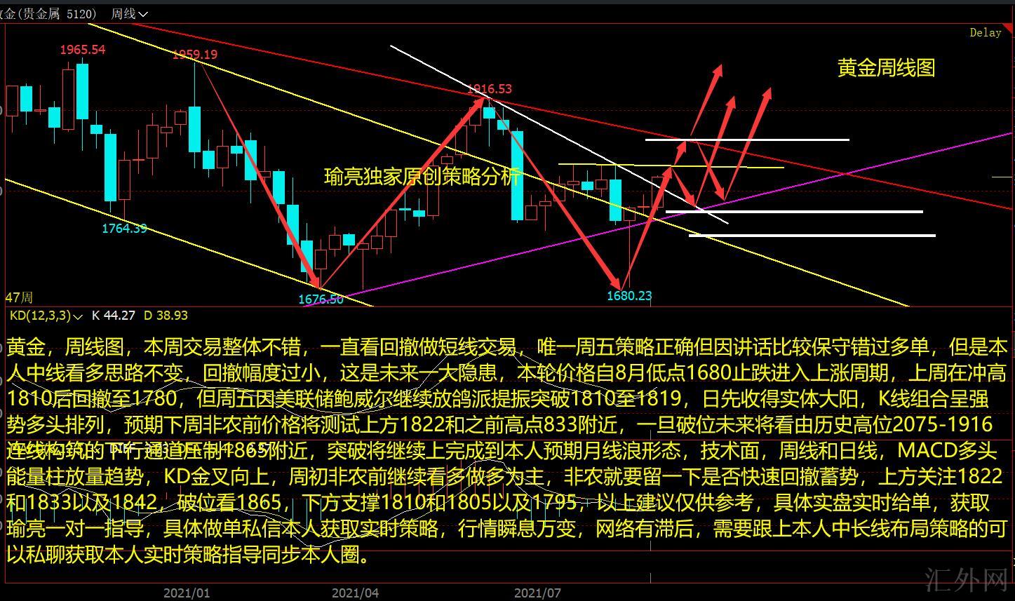 黄金,周线图,这周交易整体不错,一直看回撤做短线交易,唯一星期五策略正确但因发言比较保守错过多单,但是本人中线看涨思路不变,回撤程度过小,这是将来一大隐患,此次价格从8月低位1680止跌进入上升周期,上周在冲顶1810后回撤到1780,但星期五因美联储鲍威尔持续放鸽派提升击穿1810到1819,日先收得实体大阳,K线组合呈强劲买方排列,预计下周非农就业数据前价格将试探上方1822和以前高位833左右,一旦突破将来将看由前期新高2075-1916连线构筑的下探通道抑制1865左右,击穿将持续上完成到本人预计月线浪形态,技术分析,周线和日K线,MACD买方能量柱放量趋势,KD金叉往上,周初非农就业数据前持续看涨买涨为主,非农就要留一下能否迅速回撤蓄势,上方注意1822和1833以及1842,突破看1865,以下支撑1810和1805以及1795,以上推荐仅供参考,具体实盘实时给单,获取瑜亮一对一指导,具体做单私信本人获取实时策略,行情瞬息万变,网络有落后,需求跟上本人中长线布局策略的可以私聊获取本人实时策略指导同步本人圈。