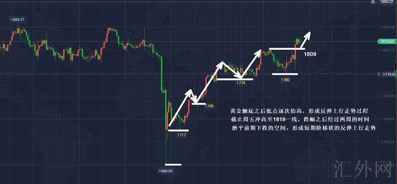 短线图四小时图上单阳回涨拉起,顶开布林道上缘,这周周初短线将依托击穿口1806做短时间买方临界点,同期也是日K线击穿下探趋势线的反转趋势线。强劲行情回踩空间有限,故早盘略微回踩就要乐观进多,不然保持性上升,极容易踏空点位,初始的首个支撑1812左右可直接进多,计划向上瞧1830一带。