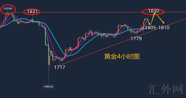 黄金技术分析分析:上周黄金行情冲顶后回修震荡,等候鲍威尔发言,而星期五夜里鲍威尔发言平和,未达市场以及在此之前多位美联储官员发言的转鹰预计,致使黄金短时推涨回弹,再次冲破1810,最终日K线报得一阳线。