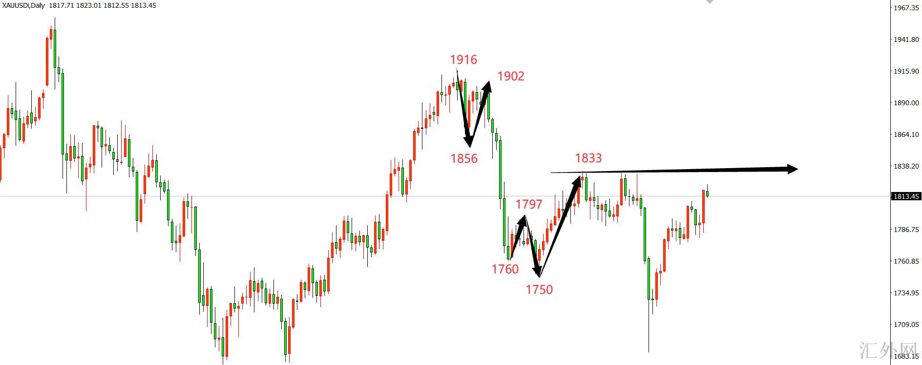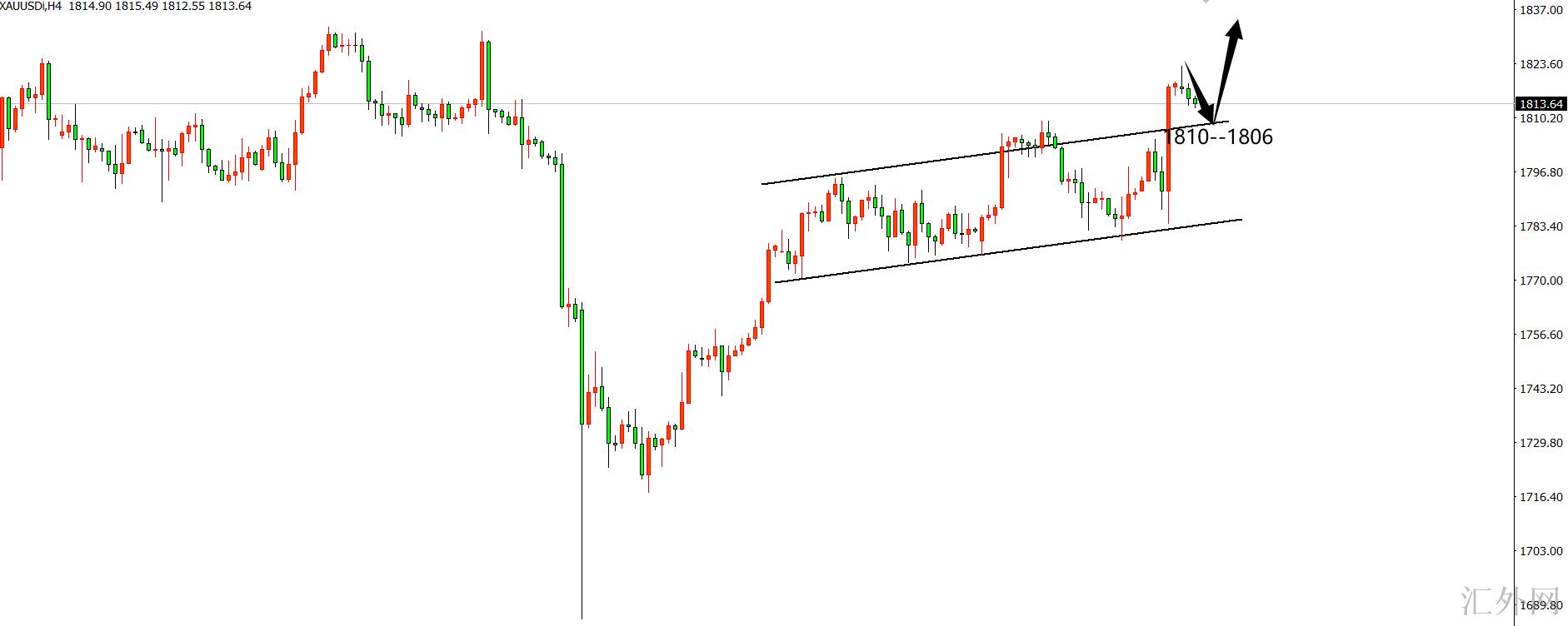 但是,最终胳膊拧然而大腿,杰克逊霍尔年会上,美联储主席鲍威尔发言,主体阐述了有关所缩债的困难,通货膨胀的困难,加息的困难等等。一连串的讲话刺激了黄金短线上升13美元,增速摸底试探支撑点1783一线增速上涨至日K线级别顶部高位1809之上,受情绪性的影响,星期五收盘于1818一线。