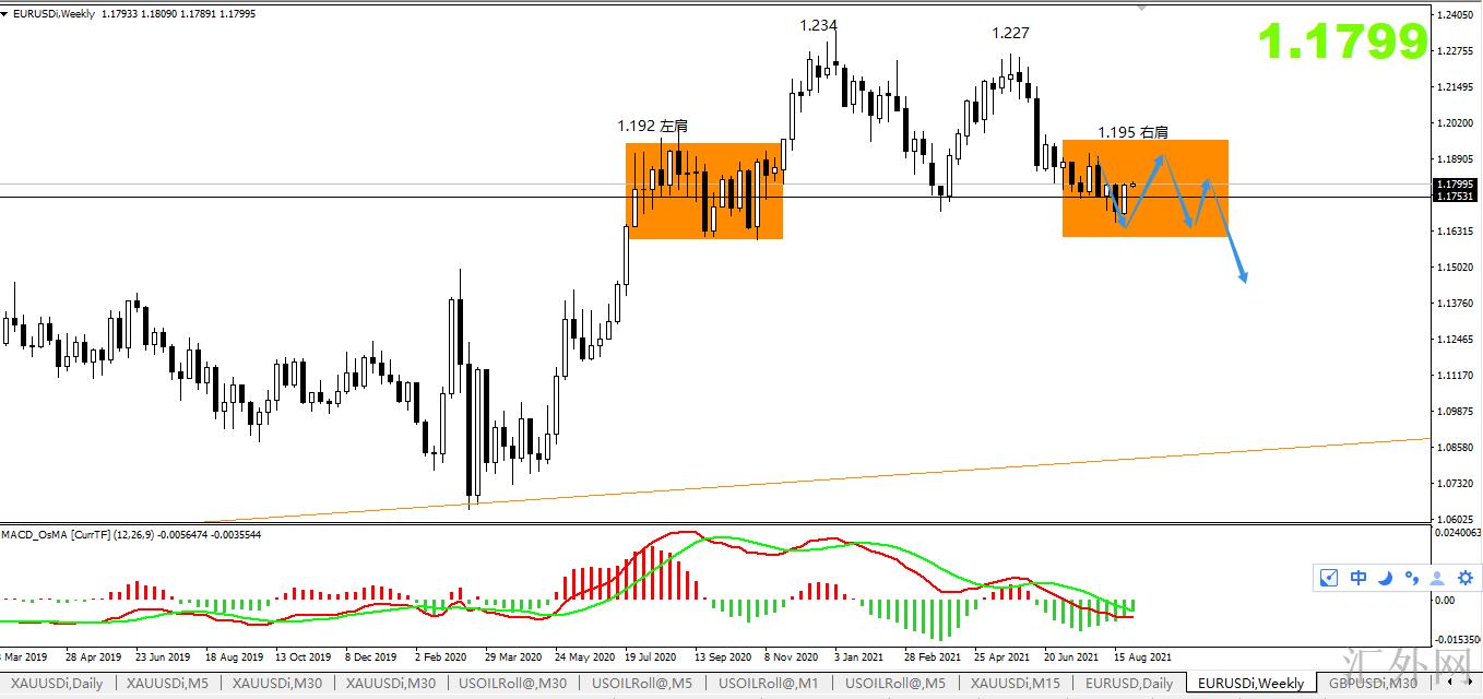 欧元兑美元大周期看跌不变,后半年进入1.14时代就在眼前,但是顶部不是一朝一夕形成的,9月中旬前关注周线复合型头肩顶右肩的组成,又一次入场空单的位置在1.195,。