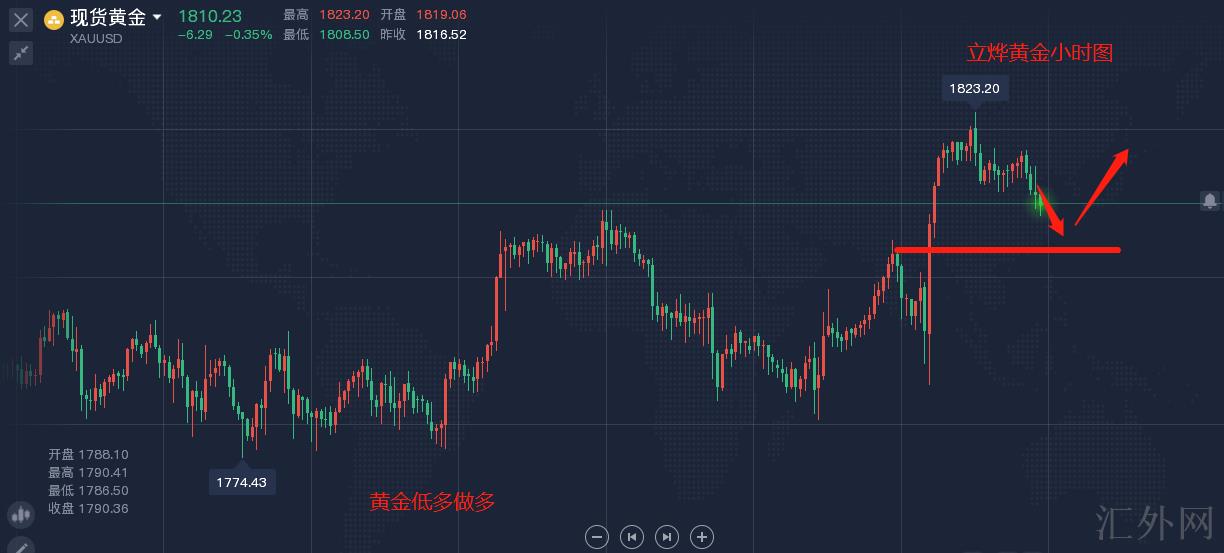今天黄金的高点横盘后,最终依旧下挫了,短时间黄金下挫到以下的支持点即1800左右,关注支撑强度,不破我们可以直接买涨黄金。
