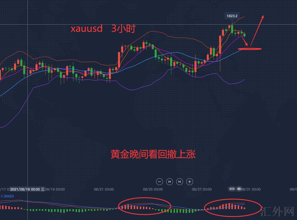 黄金自上周击穿1800,这周又一次巩固战果,亚盘强劲上升最高1823,随后是回踩环节,黄金最近行情偏多,当前结构上呈现低多行情3小时周期内午夜开始缩量,至于价格走上黄金保持在日K线周期内的MA5及4小时中轨联合支撑。