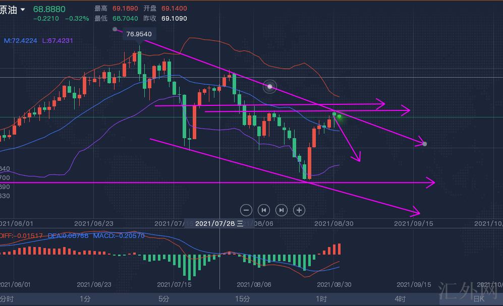 原油层面、昨日原油欧元兑美元盘震荡偏多,凌晨冲顶环绕69左右震荡仍未二次破高,短时间原油下探量能表现不足,昨日也刚好刷新日K线下滑通道上缘抑制回调,同期也是前期高位,所以原油守稳69.6仍看调动回调,今日原油斟酌69.1左右空。