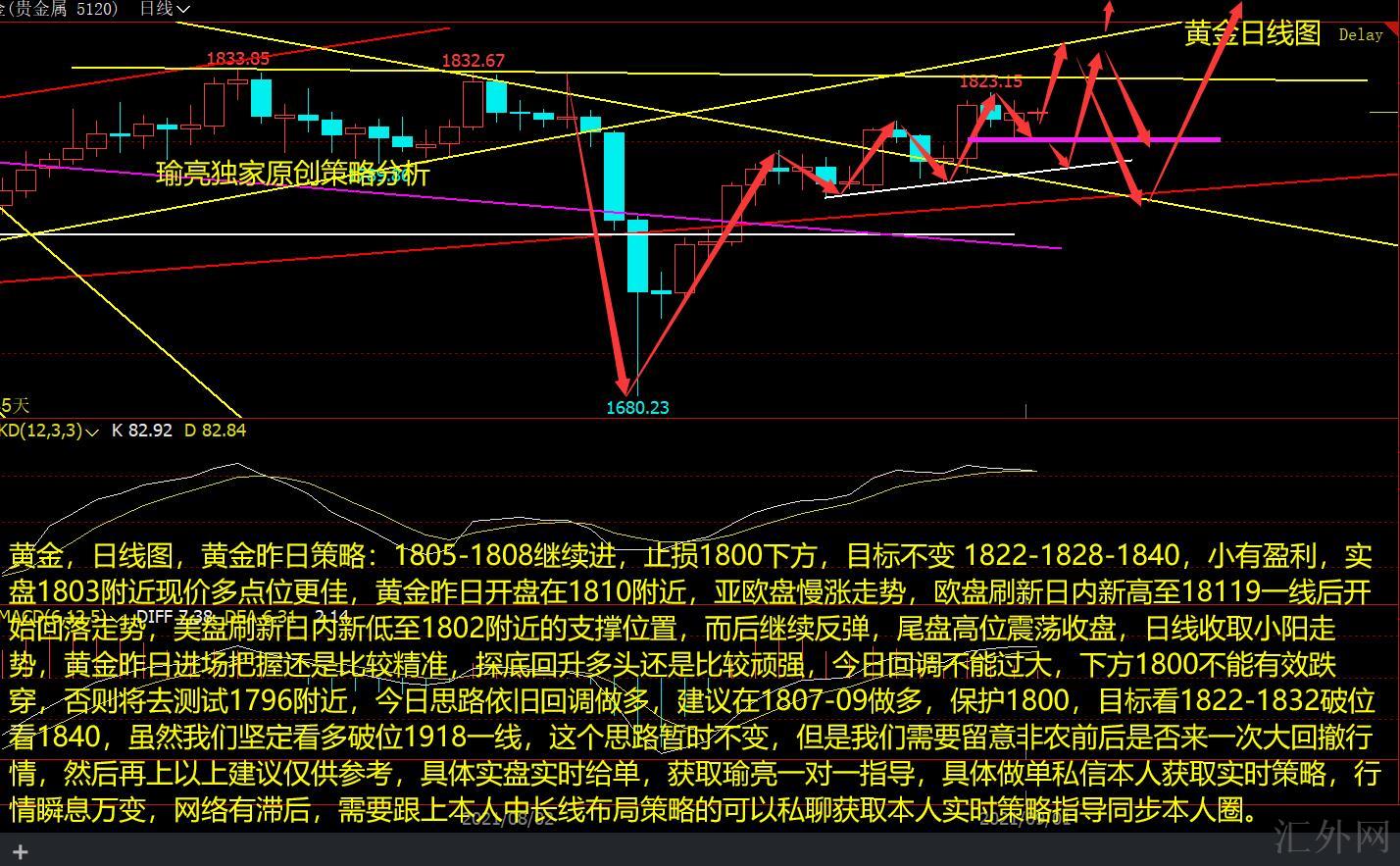 黄金,日K图,黄金昨日策略:1805-1808持续进,止损1800以下,计划不变 1822-1828-1840,小有盈利,实盘1803左右现价多点位更佳,黄金昨日开盘在1810左右,亚欧盘慢涨行情,欧盘创下日间高峰到18119一线后开始回调行情,美盘创下日间新低到1802左右的支持点置,而后持续回弹,收盘高点震荡收盘,日K线收取小阳行情,黄金昨日进场把握依旧比较准确,摸底回涨买方依旧比较顽强,今日回踩不能过大,以下1800不能有效跌穿,否则将去试探1796左右,今日思路依旧回踩买涨,推荐在1807-09买涨,保护1800,计划看1822-1832突破看1840,尽管我们坚定看涨突破1918一线,这个思路临时不变,但是我们需求留心非农就业数据前后能否来一次大回撤行情,随后再上,以上推荐仅供参考,具体实盘实时给单,获取瑜亮一对一指导,具体做单私信本人获取实时策略,行情瞬息万变,网络有落后,需求跟上本人中长线布局策略的可以私聊获取本人实时策略指导同步本人圈。