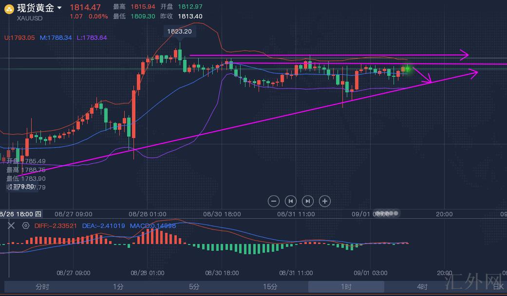 黄金层面、昨日黄金美盘时段刷新1801.5摸底回涨,卖方未能达到保持,收盘走震荡。从形态来说,星期一冲顶回调未能一鼓作气形成击穿,短时间往上击穿1833前高抑制的机会性比较小。昨日又一次摸底价格环绕四小时布林带中轨左右运行,四小时布林带有收口态势,黄金短时间震荡结构哦显著恐会保持震荡至非农,交易参考上依托昨日凌晨高位1816左右仍可布局空。