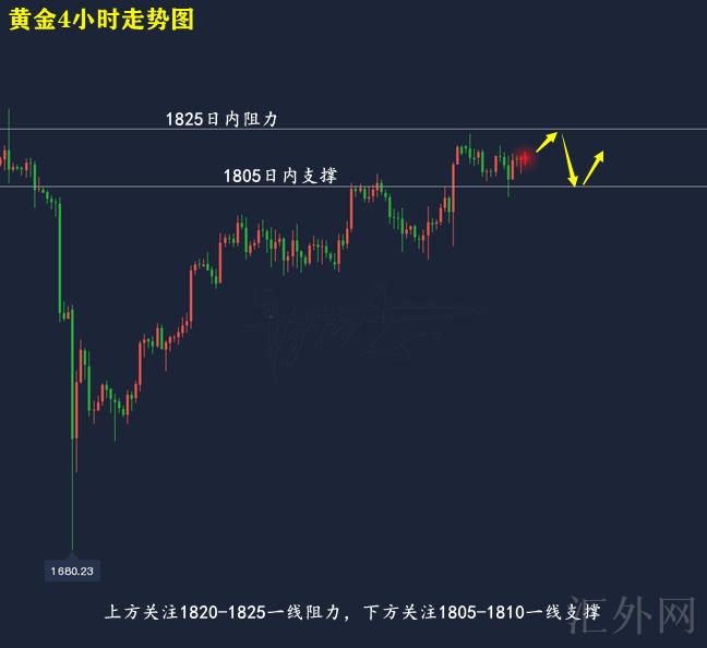 黄金技术分析来分析,日K线上,隔日黄金盘中涨跌互现,亚盘最多冲顶后回调,美盘再摸底回涨,盘中报得带上下影线的中阳,日K线上,今日行情依托MA5日移动均线上升,但仍未打破高位,日间仍有高点盘整的机会性;4小时上,隔日黄会开盘适当冲顶后回调,失守中轨位置后回涨,目前布林带马上收口,MA均线三线往上,KDJ随机指标三线并拢往上,MACD指标底背离,快慢线平行向前,综合来说,黄金当前处在上涨当中,但仍未打破最近高位及前高,日间仍有回调的机会性,日间交易参考高空低多执行操作,上方注意1820-1825一线压力,以下注意1805-1810一线支撑。