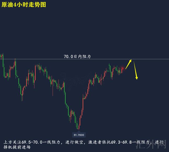 原油技术分析来分析,日K线上,隔日原油白盘适当冲顶后回调,并在失守MA5日移动均线后适当回涨,报得带上下影线的中阴,日K线上,今日行情依托MA5日移动均线上升,但量能或不足,仍有下探机会;4小时上,隔日行情遇阻于上缘后回调,短线失守中轨后回涨,持于高点运行,目前布林带马上收口,MA均线迈出金叉,KDJ随机指标三线并拢往上,MACD指标绿色量能柱开始缩量,快慢线平行向前,综合来说,原油即使当前处在上涨,但仍未打破周线压力,日间推荐持续买跌,上方注意69.5-70.0一线压力,激进派依托69.3-69.8一线压力执行提早进场。