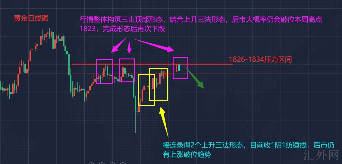 黄金日K图接连报2个上涨三法形态,当前收1阴1纺锤线1十字线,形态未承受损坏,可持续看多。行情整体有构筑三山顶部形态之势,上部阻力位位于1826-1834左右,当前行情最高企及1823左右,虽已靠近阻力位,但江老师觉得后市几率会击穿这周高位1823,完成三山形态后再行下挫!