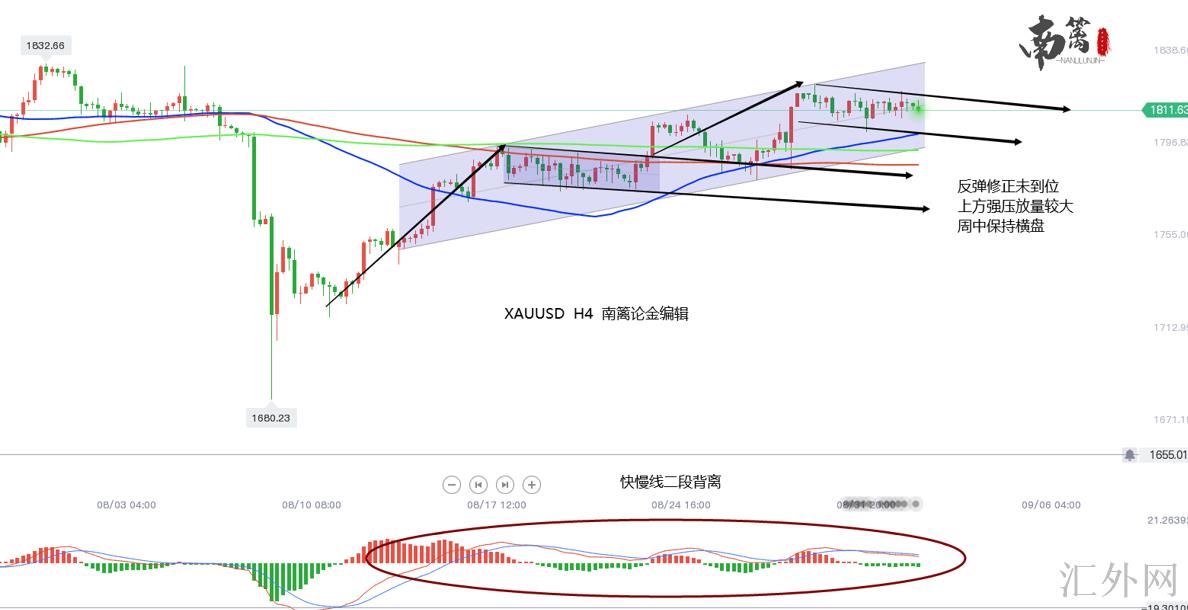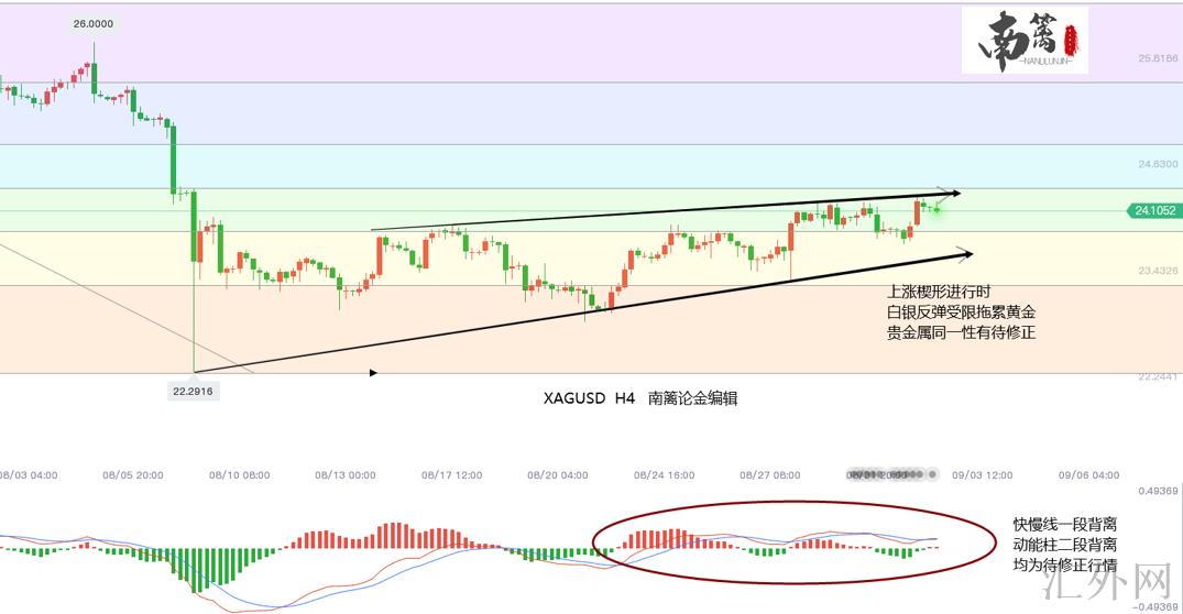 在昨天视频中我讲过,为何黄金当下有上升通道有大周期下挫通道的回踩但就是不涨?不导致由于主力在高点的埋伏,更有白银这个拖后腿的。白银的看多结构并没有完整,甚至在4H中形成了看空的顶背离修正,二段背离的渐渐成型使看涨形态越来越难。而金银的同一性失效致使贵金属市场涨跌并没有相同,资金被分散,黄金去哪里找更买方寸助推呢。