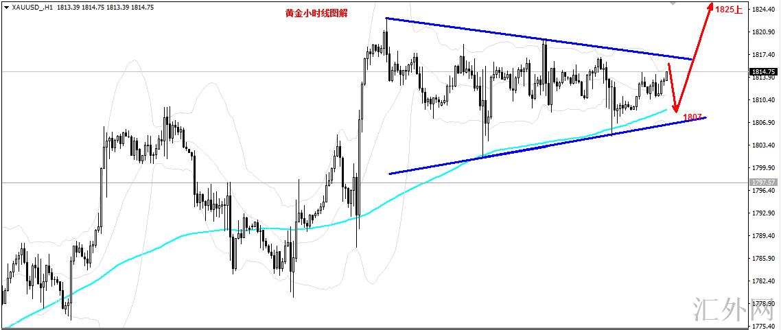 黄金接连两次回撤均在1800上止住了下跌趋势,低位持续抬高,有解脱三角形调动的痕迹。而三角形调动,是典型的中持续涨形态。所以,黄金美盘我们准备布局多,现价1815线多,以下支撑1807上干多,计划看击穿1820,目睹1832一线。