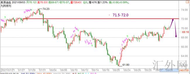 原油从技术分析来说,日K线级别,震荡回弹;MACD金叉,KDJ金叉,原油价格顶破69.64左右核心压力,短线看多信号有所增长,当前正承受55日移动均线和前期下挫通道上缘70.51左右压力抑制,假使能够顶破该压力,则有希望从新涨向前期高位76.98左右,甚至是80关键点位左右。诚然,76.98-61.94下跌趋势的61.8%回撤位71.15左右压力也需求给予简单留心。由于KDJ高点发出超买信号,假使原油价格连续未能顶破70.51左右压力,并回调到11日移动均线68.59以下,则需求注意重返下跌趋势的风险;更深一步支撑在21日移动均线67.46左右,8月25号低位支撑在66.93左右。