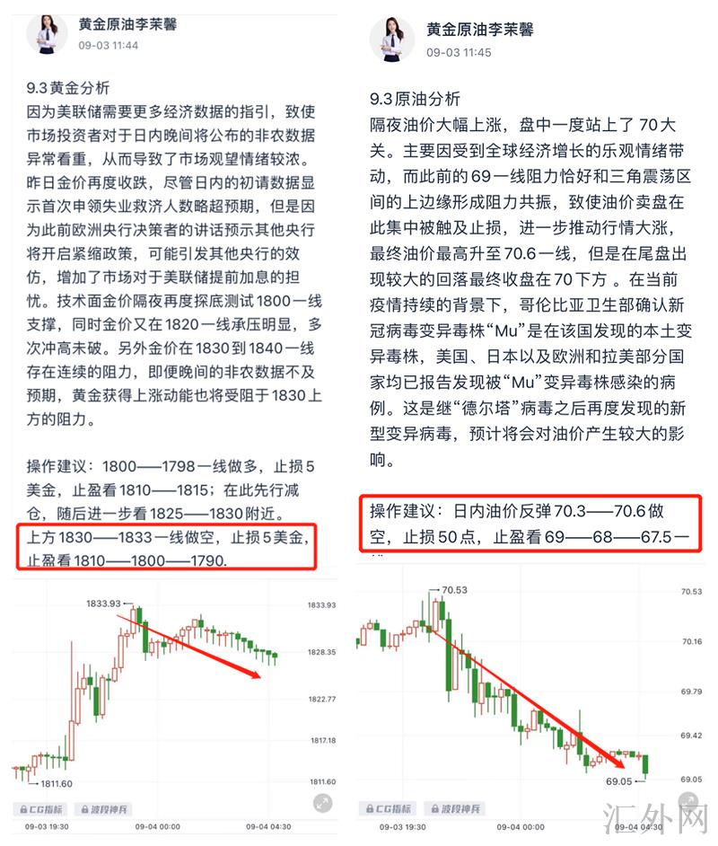 星期五茉馨给到黄金最高点1830-1833的空单,非农就业报告发布后行情完美回弹此区域,当前空单仍持有中;原油也是给到了日间顶部的区域空单,完美扫到第一止盈计划。