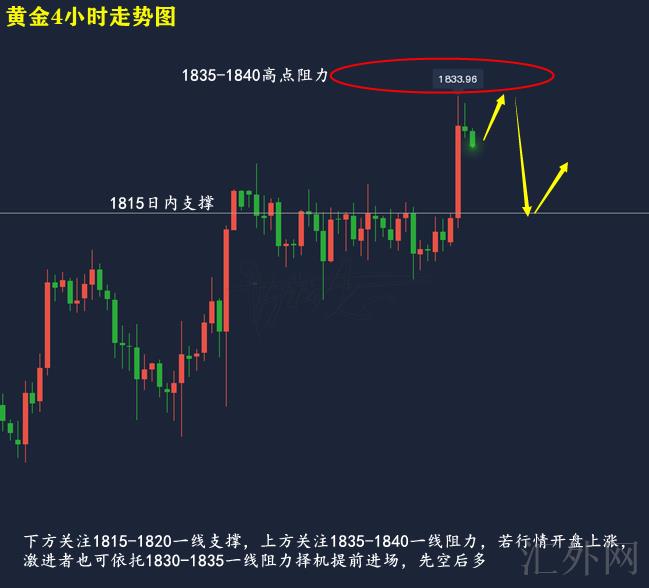 黄金技术分析来分析,日K线上,星期五黄金持续依托MA10日移动均线展开上升,盘中涨至日间高点后回调,报得带上影线的中阳,日K线上,受于行情仍未有效持稳高位,也有机会高点盘整;4小时上,星期五黄金短暂持于中轨左右运行后,夜里展开往上推涨,并刺破上缘后适当回调,目前布林带处在开口期,MA均线三线往上,KDJ随机指标三线微微朝下弯钩,MACD指标红色量能柱连续放量,快慢线金叉往上,综合来说,黄金当前短时间或仍有下探,待跌向支撑后恐会持续上升,下星期一交易参考回撤买涨为主,回弹买跌为辅,以下注意1815-1820一线支撑,上方注意1835-1840一线压力,激进派若行情开盘上升可依托1830-1835一线压力左右执行先空后多。